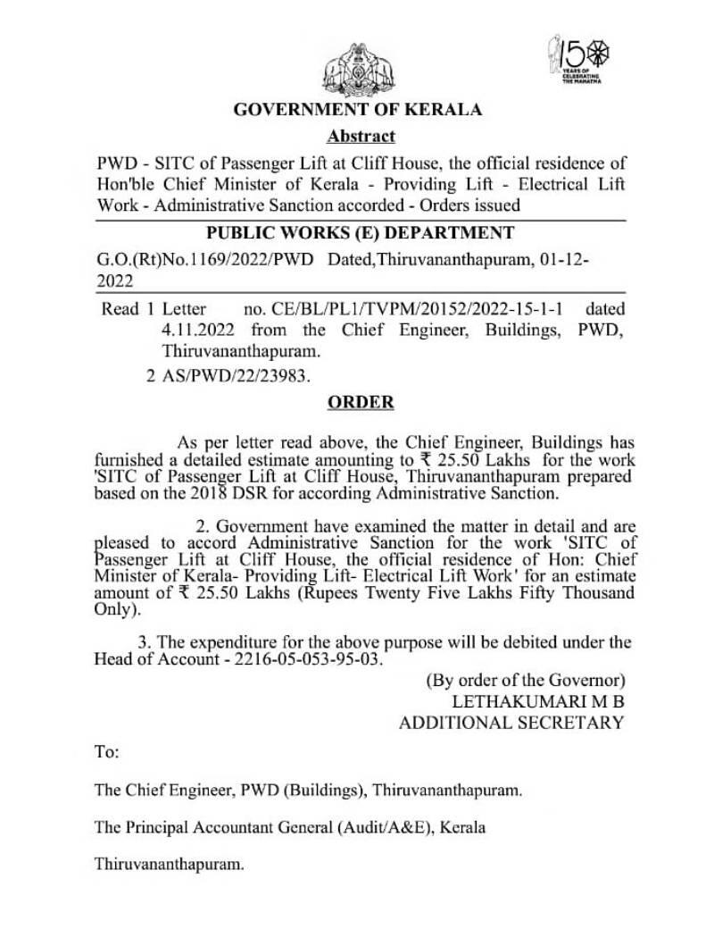 മുഖ്യമന്ത്രിയുടെ ഔദ്യോഗികവസതിയിൽ ലിഫ്റ്റ് സ്ഥാപിക്കാൻ പൊതുമരാമത്ത് വകുപ്പ് 25.50 ലക്ഷം രൂപ അനുവദിച്ചു