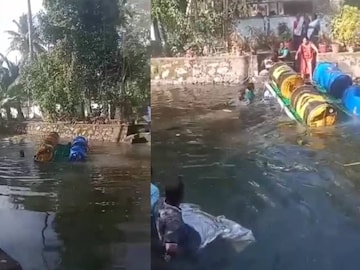 പഞ്ചായത്ത് അനുവദിച്ച ചങ്ങാടം കന്നിയാത്രയിൽ തന്നെ മറിഞ്ഞു; ഉദ്ഘാടകനായ പ്രസിഡന്റും വെള്ളത്തിൽ