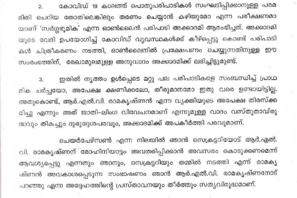 "നാല് വർഷമായി അക്കാദമി മികച്ച രീതിയിൽ പ്രവർത്തിക്കുകയാണെന്നും രാമകൃഷ്ണന് അവസരം നൽകിയാൽ വിമർശനത്തിന് ഇടയാക്കുമെന്നും " കെ രാധാകൃഷ്ണൻ നായർ പറഞ്ഞഞതായി കെ പി എ സി ലളിത തന്നോട് വെളിപ്പെടുത്തിയെന്നും രാമകൃഷ്ണൻ വ്യക്തമാക്കിയിരുന്നു. സംഭവം വിവാദമായതോടെ കെ.പി.എ.സി ലളിത ഇന്ന് പത്രക്കുറിപ്പ് ഇറക്കി. സത്യവിരുദ്ധമായ പ്രസ്താവനയാണ് രാമകൃഷ്ണൻ നടത്തുന്നതെന്നാണ് പത്രക്കുറിപ്പിൽ പറയുന്നത്. രാമകൃഷ്ണന് വേണ്ടി സെക്രട്ടറിയുമായി സംസാരിച്ചിട്ടില്ലെന്നും നൃത്ത പരിപാടിക്ക് അപേക്ഷ ക്ഷണിച്ചിട്ടില്ലെന്നുമായിരുന്നു പത്രക്കുറിപ്പിൻ്റെ ഉള്ളടക്കം.
