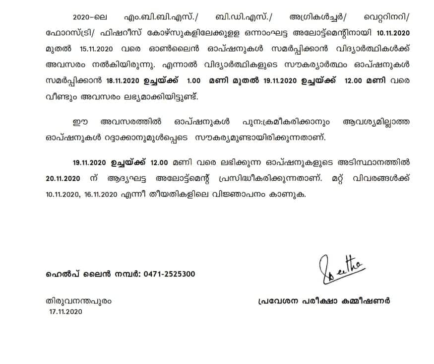 2020-ലെഎം.ബി.ബി.എസ്./ബി.ഡി.എസ് ഓൺലൈൻ ഓപ്ഷനുകൾ സമർപ്പിക്കാൻ വിദ്യാർത്ഥികൾക്ക് നൽകിയ അവസരം ഞായറാഴ്ച അവസാനിച്ചിരുന്നു. സ്വാശ്രയ മെഡിക്കൽ മാനേജ്മെൻറ് കൾ ആവശ്യപ്പെട്ട് ഫീസ് വിജ്ഞാപനത്തിലൂടെ പ്രവേശന പരീക്ഷാ കമ്മിഷണർ അറിയിച്ചതോടെ ഓപ്ഷൻ പുനക്രമീകരിക്കാനുളള സമയം ദീർഘിപ്പിച്ചു. ബുധനാഴ്ച ഉച്ചക്ക് 12 മുതൽ വ്യാഴാഴ്ച ഉച്ചക്ക് 12 വരെ ഓപ്ഷനുകൾ മാറ്റി നൽകാം. വെള്ളിയാഴ്ച ആദ്യഘട്ട അലോട്ട്മെൻറ് പ്രസിദ്ധീകരിക്കും.