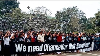'ഞങ്ങള്ക്ക് വേണ്ടത് ചാന്സലറെയാണ്, സവര്ക്കറയല്ല' എന്ന് എഴുതിയ ബാനര് എസ്എഫ്ഐ പ്രവര്ത്തകര് ഉയര്ത്തി.