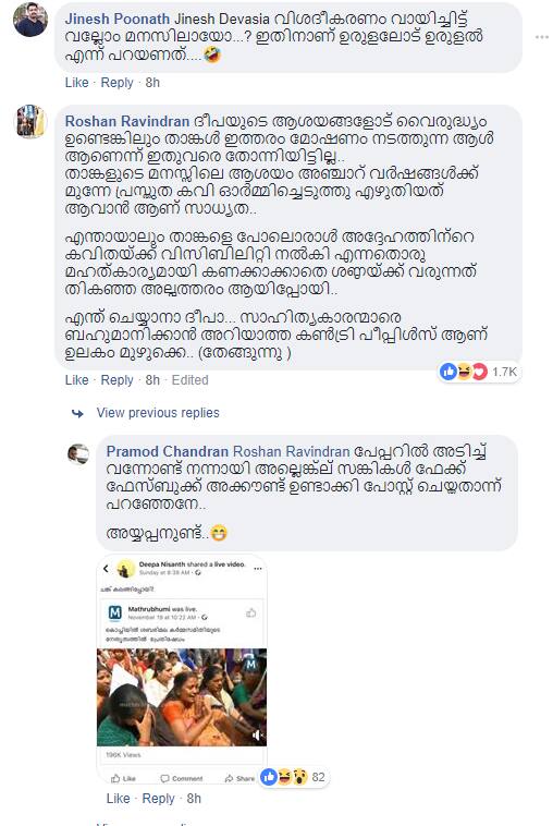 മറ്റൊരാള് എഴുതിയിരിക്കുന്ന രസകരമായ കമന്റ് ഇങ്ങനെ; 'ദീപയുടെ ആശയങ്ങളോട് വൈരുദ്ധ്യം ഉണ്ടെങ്കിലും താങ്കള് ഇത്തരം മോഷണം നടത്തുന്ന ആള് ആണെന്ന് ഇതുവരെ തോന്നിയിട്ടില്ല..