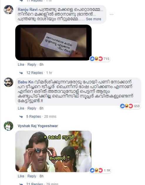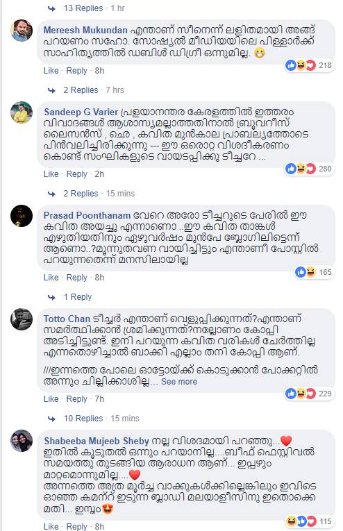 'ഇത് നിങ്ങള് പേരെടുക്കുന്നതിന്റെയോ അല്ലാത്തതിന്റെയോ പ്രശ്നമല്ല. ടീച്ചര് ഒരാളുടെ മൗലിക കൃതി കട്ടെടുത്തോ ഇല്ലയോ എന്നതിന്റെ ലവേശര െനെ ചൊല്ലിയുള്ളതാണ്. മുമ്പ് വന്ന ഒരു കവിതയുടെ പകര്പ്പ് സ്വന്തം പേരില് അച്ചടിച്ചു വരുമ്പോള് അതിനു ശരിയായ വിശദീകരണം വായനക്കാര് അര്ഹിക്കുന്നുണ്ട്. അതിന് പകരം എനിക്ക് കവിതയെഴുതി പ്രശസ്തയാവണ്ട എന്ന മറുന്യായമല്ല മറുപടി.' എന്നാണ് ഒരാള് കുറിച്ചിരിക്കുന്നത്.