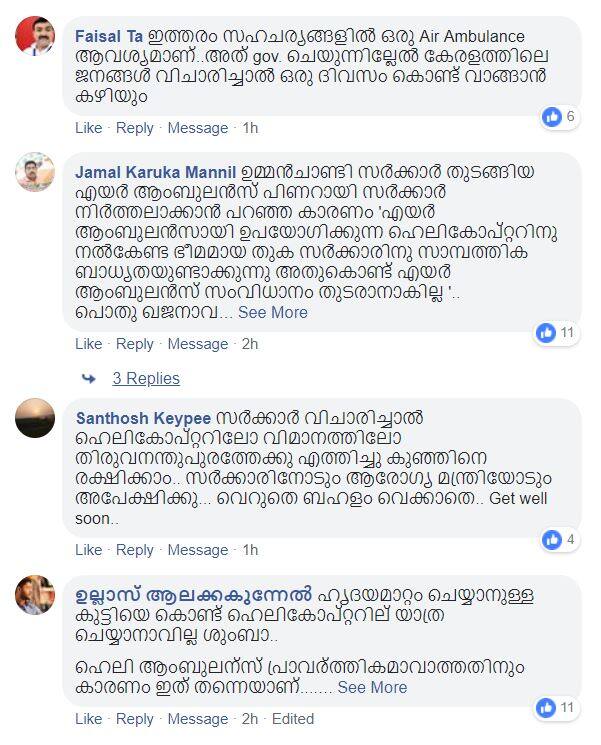 ഇത്തരം സഹചര്യങ്ങളിൽ ഒരു എയർ ആംബുലൻസ് ആവശ്യമാണെന്നും അത് സർക്കാർ ചെയുന്നില്ലേൽ കേരളത്തിലെ ജനങ്ങൾ വിചാരിച്ചാൽ ഒരു ദിവസം കൊണ്ട് വാങ്ങാൻ കഴിയുമെന്ന് ചലഞ്ച് ചെയ്യുന്നവരും സോഷ്യൽമീഡിയയിൽ ഉണ്ട്.