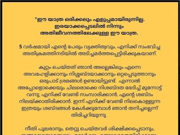 കുറ്റം ചെയ്തത് ഞാൻ അല്ലെങ്കിലും എന്നെ അവഹേളിക്കാനും നിശബ്ദയാക്കാനും ഒറ്റപ്പെടുത്താനും ഒരുപാട് ശ്രമങ്ങൾ ഉണ്ടായിട്ടുണ്ട്. എന്നാൽ അപ്പോളൊക്കെയും ചിലരൊക്കെ നിശബ്ദത ഭേദിച്ച് മുന്നോട്ടു വന്നു; എനിക്ക് വേണ്ടി സംസാരിക്കാൻ, എന്റെ ശബ്ദം നിലയ്ക്കാതിരിക്കാൻ. ഇന്ന് എനിക്ക് വേണ്ടി നിലകൊള്ളുന്ന ഇത്രയും ശബ്ദങ്ങൾ കേൾക്കുമ്പോൾ ഞാൻ തനിച്ചല്ലെന്ന് തിരിച്ചറിയുന്നു.