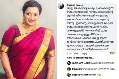 അതേസമയം, സ്വപ്നയുടെ മറ്റൊരു കമന്റും ഇതിനകം ശ്രദ്ധേയമായിട്ടുണ്ട്. അതിൽ, രാജ്യത്തിന്റെ മുതല് വിദേശത്തേക്ക് അല്ലല്ലോ കൊണ്ടുപോയതെന്നും വിദേശത്തു നിന്നും രാജ്യത്തേക്ക് മുതല് കൊണ്ടു വന്നതിൽ എന്ത് നഷ്ടമാണ് നമ്മുടെ രാജ്യത്തിനുള്ളതെന്നുമാണ് ചോദിക്കുന്നത്.