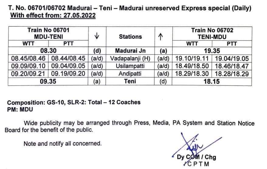 റെയില്വേ ലൈൻ ഇല്ലാത്ത ഇടുക്കി ജില്ലയിലെ കട്ടപ്പനക്കാർക്ക് (Kattappana) ഇനി ട്രെയിന് കയറാന് വെറും 60 കിലോമീറ്റര് ദൂരം സഞ്ചരിച്ചാല് മതി. തമിഴ്നാട്ടിലെ തേനി (Teni) റെയില്വേ സ്റ്റേഷനില് നിന്നുള്ള സര്വീസ് മെയ് 27 വെള്ളിയാഴ്ച ആരംഭിക്കും.തേനി-ആണ്ടിപ്പെട്ടി-ഉസിലാംപെട്ടി-വടപളഞ്ഞി വഴി മധുരയിലേക്ക് ട്രെയിനിൽ അറുപത്തിയഞ്ച് മിനിറ്റ് സമയം കൊണ്ട് എത്തിച്ചേരും.
