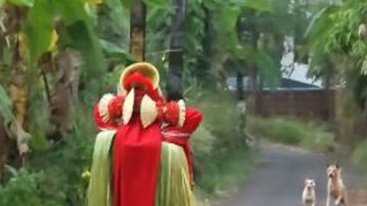 തെയ്യത്തിന് നേരെ കുരച്ചുചാടി തെരുവുനായ്ക്കൾ; അട്ടഹസിച്ച് ചിലമ്പ് കുലുക്കിയതോടെ തിരിഞ്ഞോടി നായ്ക്കൾ