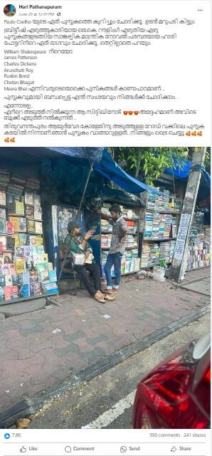 തിരുവനന്തപുരം ജില്ലയുടെ സവിശേഷതകൾ ഒന്നാണ് തെരുവോരങ്ങളെ നിറയുന്ന പുസ്തക കച്ചവടം. തിരുവനന്തപുരം ആയുർവേദ കോളേജിന് മുന്നിലുള്ള പുസ്തക കടയിൽ നിന്നും തനിക്കുണ്ടായ അനുഭവം പങ്കുവെച്ച് രംഗത്തെത്തിയിരിക്കുകയാണ് ഹരി പത്തനാപുരം.