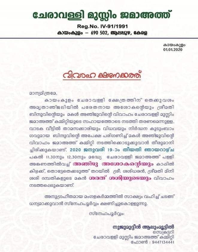 പരേതനായ അശോകന്റെയും ബിന്ദുവിന്റെയും മകള് അഞ്ജു അശോകന്റെ വിവാഹം ആഘോഷപൂര്വ്വം നടത്തി കൊടുക്കുന്നത് കായംകുളം ചേരാവള്ളി മുസ്ലീം ജമാഅത്ത് കമ്മിറ്റിയാണ്.