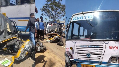 പാർക്കിങ് സ്ഥലത്തു നിന്ന് റോഡിലേക്ക് ഇറങ്ങുകയായിരുന്ന കാറിൽ തട്ടി നിയന്ത്രണം നഷ്ടപ്പെട്ട ഓട്ടോറിക്ഷ എതിർ ദിശയിൽ നിന്നും വന്ന ബസുമായി കൂട്ടിയിടിക്കുകയായിരുന്നു
