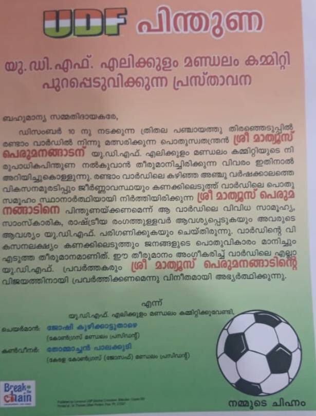 എൻ.സി.പി.നേതൃത്വത്തിൻ്റെ മൗനാനുവാദത്തോടെ മത്സരിക്കുന്ന മാത്യൂസിൻ്റെ ചിഹ്നം ഫുട്ബോളാണ്.