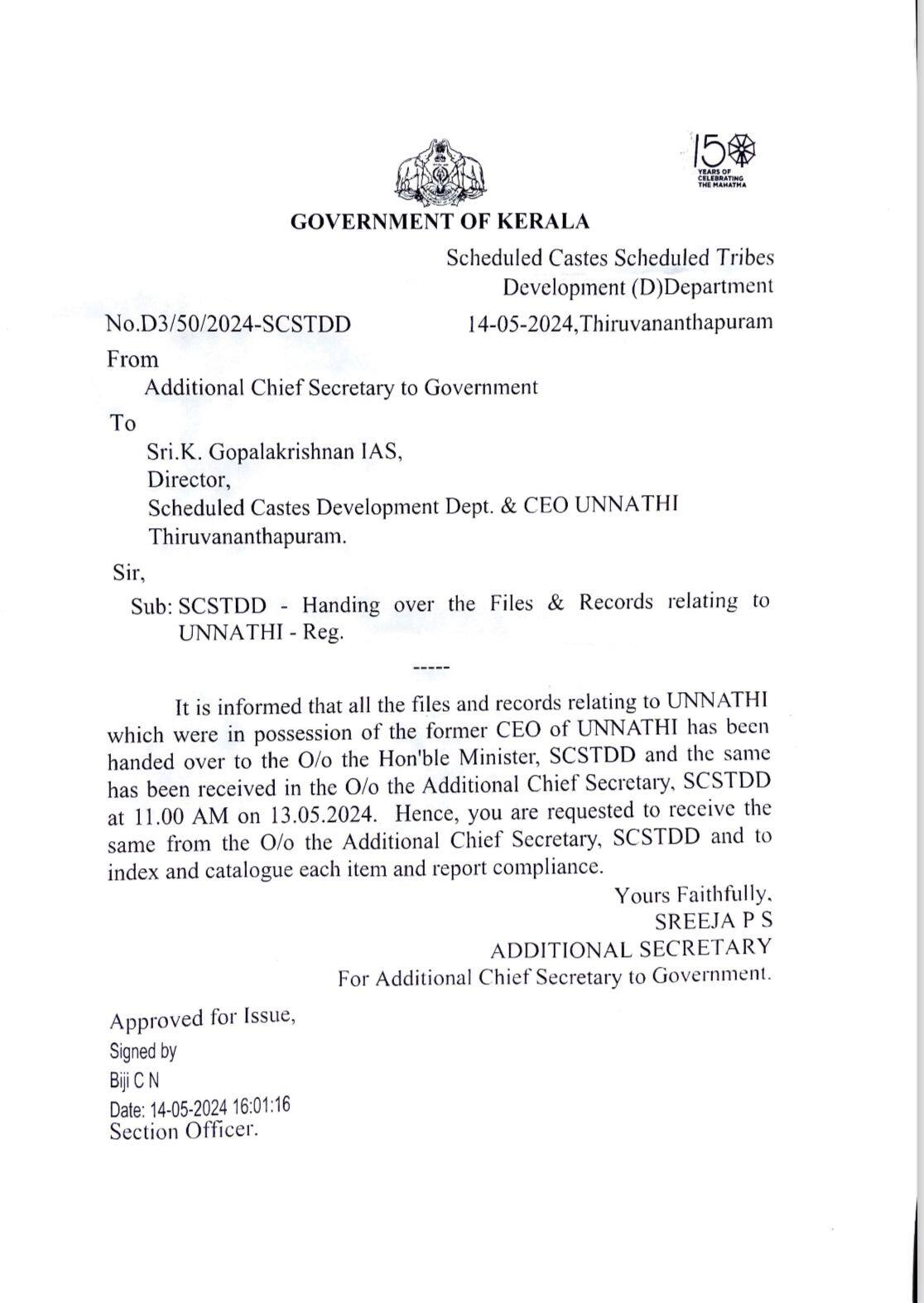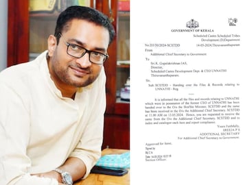 വകുപ്പ് സെക്രട്ടറിയായിരുന്ന എ ജയതിലകുമായുള്ള അഭിപ്രായ ഭിന്നതയെ തുടർന്നാണ് സ്ഥാനമൊഴിയുന്നതിന് മുൻപ് പ്രശാന്ത് ഫയലുകള് അന്നത്തെ മന്ത്രി രാധാകൃഷ്ണനെ ഏൽപിച്ചത്. 'ഉന്നതി'യുമായി ബന്ധപ്പെട്ട എല്ലാ ഫയലുകളും മന്ത്രിയുടെ ഓഫീസിൽ കിട്ടിയെന്ന് വ്യക്തമാക്കി എ ജയതിലക് തന്നെ മേയ് 14ന് കത്ത് നൽകി. പ്രശാന്തിന് പിന്നാലെ സിഇഒ ആയി ചുമതലയേറ്റ കെ ഗോപാലകൃഷ്ണനാണ് ജയതിലക് കത്ത് നൽകിയത്. എന്നാൽ പ്രശാന്തിനെതിരെ അന്വേഷണം നടത്തിയ ചീഫ് സെക്രട്ടറി ഈ വിഷയം പരിശോധിച്ചില്ല.