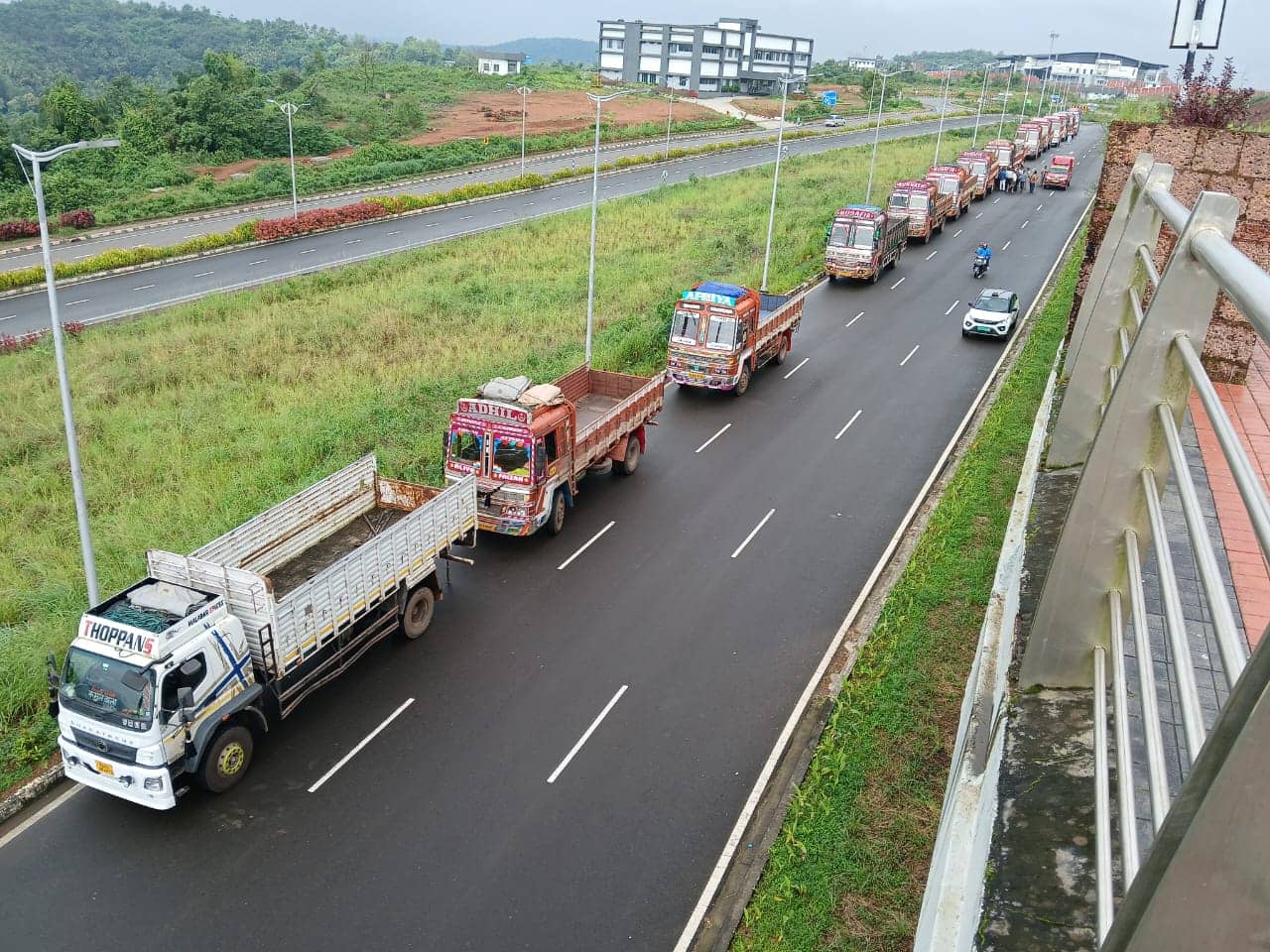 ചൂരൽ മലയിലേക്കുള്ള പാലം നിർമ്മാണ സാമഗ്രികൾ കൊണ്ടുപോകുന്നതിനായി കണ്ണൂർ വിമാനത്താവളത്തിൽ എത്തിയ ട്രക്കുകൾ