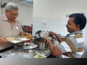 ‘ഇത് ഞങ്ങളുടെ പതിവു ജീവിതത്തിൻ്റെ ഭാഗമാണ്. ചിലപ്പോൾ മീറ്റിംഗുകളും മറ്റുമുള്ളപ്പോൾ, ധാരാളം ആളുകൾ മെസ്സിലെത്തും. അപ്പോൾ ഞങ്ങളെല്ലാവരും വരി നിന്ന്, പ്ലേറ്റുകൾ സ്വയമെടുത്ത് ഭക്ഷണം സ്വയം വിളമ്പാറാണ് പതിവ്. ചിലപ്പോൾ പാചകക്കാരൻ സഹായിക്കാറുണ്ട്. ഇവിടെ ഇങ്ങനെയാണ് പതിവ്.’ യച്ചൂരി പറയുന്നു.