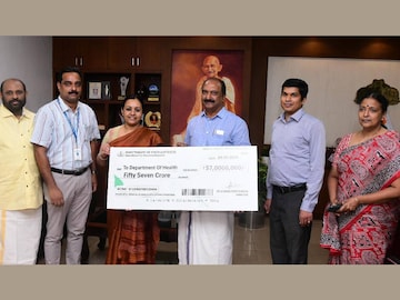 സെക്രട്ടറിയറ്റിൽ ധനമന്ത്രിയുടെ ചേംബറിൽ നടന്ന ചടങ്ങിൽ സംസ്ഥാന ധനവകുപ്പു മന്ത്രി കെ.എൻ. ബാലഗോപാലിൽ നിന്നും ആരോഗ്യമന്ത്രി വീണാ ജോർജ്ജ് ചെക്ക് ഏറ്റുവാങ്ങി