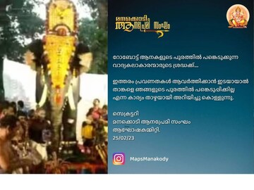 ”ആരെയും വിലക്കിയിട്ടില്ല, റോബോട്ട് പൂരങ്ങൾ ആവർത്തിക്കാൻ ഇടയായാൽ അതിനെക്കുറിച്ച് ചിന്തിക്കേണ്ടി വരും എന്നേ ഉദ്ദേശിച്ചിട്ടുള്ളൂ… അമ്പലവും ആചാരങ്ങളും ഒന്നുമല്ല ഇവിടെ ചിലർക്ക് വിഷയം.. അത് ആന എഴുന്നള്ളിപ്പ് ആണ്… കേരളത്തിൽ ആനകൾ ഇല്ലാതാവണം… തൃശൂർ പൂരവും നെമ്മാറയും ഉത്രാളിയും മറ്റു പൂരങ്ങളും ആനകൾ ഇല്ലാതെ അന്യംനിന്നുപോകണം… അതാണ് ആ മാഫിയയുടെ ഉദ്ദേശം… അതിന് പ്രേരകമാകുന്ന വിധത്തിലുള്ള നീക്കങ്ങൾക്ക് വാദ്യകലാമേഖല പിന്തുണ നൽകിയാൽ അത് വിലക്കപ്പെടേണ്ടതാണ്… (അടുത്ത കാലത്ത് ഒരു ജ്വല്ലറി ഉടമ എല്ലുകൊണ്ട് ചെണ്ട കൊട്ടി, അതിന് അങ്ങേരെക്കൊണ്ട് മാപ്പ് പറയിക്കാൻ കാണിച്ച ഉഷാർ ഒന്നും ഇക്കാര്യത്തിൽ കലാകാരന്മാരുടെ ഭാഗത്ത് നിന്നും ഉണ്ടായില്ല എന്ന് പൊതുവെ ഒരു സംസാരം ഉണ്ട്). നാളെ ഏതെങ്കിലും ഒരു കമ്മിറ്റി, ഞങ്ങൾക്ക് റോബോട്ട് ആനയും CD മേളവും മതീന്ന് തീരുമാനിച്ചാൽ പട്ടിണിയാവുന്നത് ആരാണെന്ന് കൂടി ഓർക്കുക…”- ആന പ്രേമി സംഘത്തിന്റെ വിലക്ക് അറിയിപ്പിന് താഴെ ഒരാളുടെ കമന്റ് ഇങ്ങനെ.
