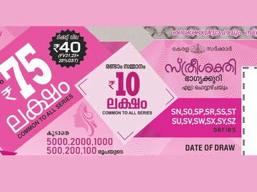 ഒന്നാം സമ്മാനം 75 ലക്ഷം രൂപയും രണ്ടാം സമ്മാനം പത്ത് ലക്ഷം രൂപയുമാണ്. എല്ലാ ചൊവ്വാഴ്ചയും നറുക്കെടുക്കുന്ന സ്ത്രീ ശക്തി ലോട്ടറി ടിക്കറ്റിന്റെ വില 40 രൂപയാണ്