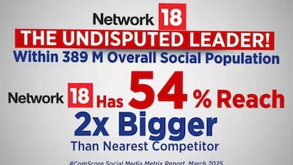 ഏറ്റവും പുതിയ കോംസ്കോർ ഡാറ്റ പ്രകാരം, ഡിജിറ്റൽ പ്ലാറ്റ്ഫോമിലും സോഷ്യൽ മീഡിയ മെട്രിക്സിലും ശക്തമായ പ്രകടനം കാഴ്ചവച്ച് 2025 മാർച്ചിൽ ഇന്ത്യൻ ഡിജിറ്റൽ വാർത്താ ശൃംഖലകളിൽ നെറ്റ്വർക്ക്18 ഒന്നാം സ്ഥാനം നേടി. ഓൺ-പ്ലാറ്റ്ഫോം നെറ്റ്വർക്ക് തലത്തിൽ, നെറ്റ്വർക്ക്18 വാർത്താ വിവര വിഭാഗത്തിൽ 183.2 ദശലക്ഷം അതുല്യ സന്ദർശകരെ (UV) സ്വന്തമാക്കി, രാജ്യത്തെ മറ്റെല്ലാ ഡിജിറ്റൽ വാർത്താ നെറ്റ്വർക്കുകളേയും പിന്നിലാക്കി.