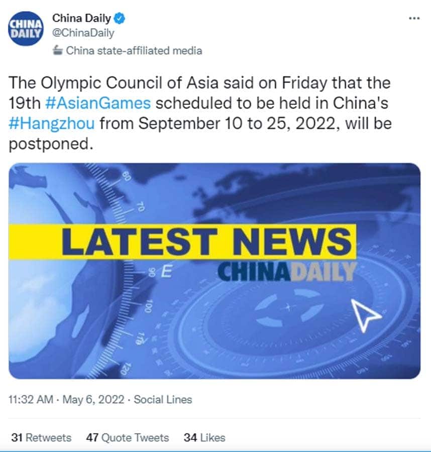 English Summary: Asian Games, which were to be held from September 10-25 in Hangzhou, have been postponed due to the pandemic, China’s state media reported on Friday. No alternative date has been announced so far. The decision comes at a time when China, where the virus emerged in late 2019, is experiencing its biggest Covid-19 outbreak. The country is battling a record number of daily cases in Shanghai, which has been under lockdown for more than a month.
