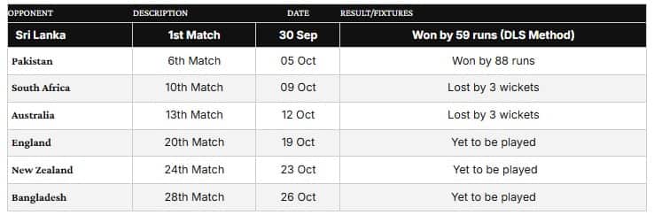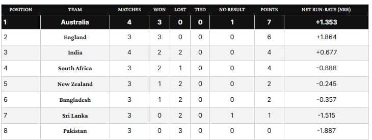 നാല് മത്സരങ്ങൾക്ക് ശേഷം, 7 പോയിന്റുമായി ഓസ്ട്രേലിയ ഒന്നാം സ്ഥാനത്തും 6 പോയിന്റുമായി ഇംഗ്ലണ്ട് രണ്ടാം സ്ഥാനത്തും തുടരുകയാണ്. ഇന്ത്യ നിലവിൽ 4 പോയിന്റും +0.677 എന്ന നെറ്റ് റൺ റേറ്റുമായി മൂന്നാം സ്ഥാനത്താണ്. ദക്ഷിണാഫ്രിക്കയും 4 പോയിന്റുമായി തൊട്ടുപിന്നിലുണ്ട്, എന്നാൽ അവരുടെ നെഗറ്റീവ് നെറ്റ് റൺ റേറ്റായ -0.888 ഇന്ത്യയ്ക്ക് മുൻതൂക്കം നൽകുന്നു. ന്യൂസിലൻഡിനും ബംഗ്ലാദേശിനും രണ്ട് പോയിന്റുകൾ വീതമുണ്ട്. അതേസമയം ശ്രീലങ്കയും പാകിസ്ഥാനും ഇതുവരെ ഒരു കളി പോലും ജയിച്ചിട്ടില്ല.