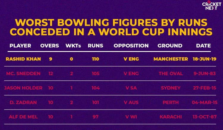 ലോകകപ്പിൽ റാഷിദ് ഖാന് നാണക്കേടിന്റെ റെക്കോർഡ്; ഒൻപത് ഓവറിൽ വഴങ്ങിയത് 110 റൺസും 11 സിക്സും