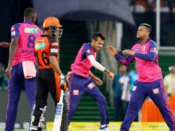 മറുപടി ബാറ്റിങ്ങിൽ ഹൈദരാബാദിന്റെ തുടക്കം തകർച്ചയോടെയായിരുന്നു. റൺസെടുക്കുംമുമ്പ് ഓപ്പണർ അഭിഷേക് ശർമ്മയെ ട്രെന്റ് ബോൾട്ട് ക്ലീൻ ബോൾഡാക്കി. തൊട്ടുപിന്നാലെ റൺസെടുക്കാതെ തന്നെ രാഹുൽ ത്രിപാഠിയെയും ബോൾട്ട് മടക്കി. ഇതോടെ രൂജ്യത്തിന് രണ്ട് വിക്കറ്റ് എന്ന പരിതാപകരമായ നിലയിലായിരുന്നു ഹൈദരാബാദ്. മായങ്ക് അഗർവാൾ പിടിച്ചുനിൽക്കാൻ നോക്കിയെങ്കിലും 27 റൺസിലെത്തി നിൽക്കെ പുറത്തായി. തുടർന്ന് കൃത്യമായ ഇടവേളകളിൽ രാജസ്ഥാൻ വിക്കറ്റുകൾ വീഴ്ത്തിക്കൊണ്ടിരുന്നു. നാലു വിക്കറ്റെടുത്ത ചാഹലാണ് ഹൈദരാബാദിനെ തകർത്തത്. വാലറ്റത്ത് പിടിച്ചുനിന്ന് അബ്ദുൽ സമദാണ് രാജസ്ഥാൻ സ്കോർ 100 കടക്കാൻ സഹായിച്ചത്. സമദ് 32 പന്തിൽ 32 റൺസെടുത്തു പുറത്താകാതെ നിന്നു. രാജസ്ഥാനുവേണ്ടി ചാഹൽ നാലു വിക്കറ്റെടുത്തപ്പോൾ ബോൾട്ട് രണ്ടു വിക്കറ്റുകൾ നേടി.