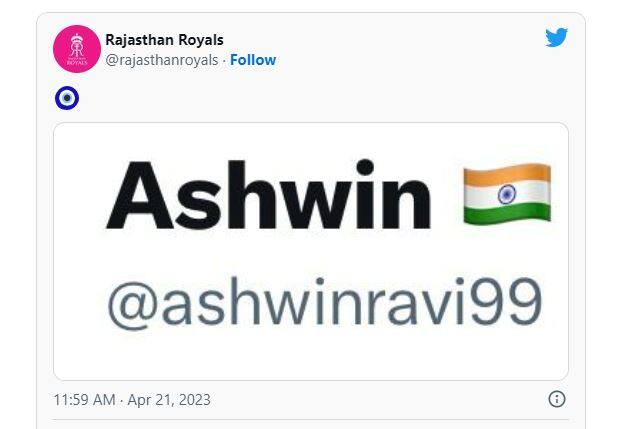 ബ്ലൂ ഐ ഇമോജിയുള്ള അശ്വിന്റെ നീല ടിക്കിന്റെ ഫോട്ടോ ഐപിഎൽ ടീം പങ്കിട്ടു. എന്നാൽ രസകരമായ കാര്യം, രാജസ്ഥാൻ റോയൽസിന്റെ ഔദ്യോഗിക അക്കൗണ്ടിന് ബ്ലൂ ടിക്ക് നഷ്ടമായി എന്നതാണ്.