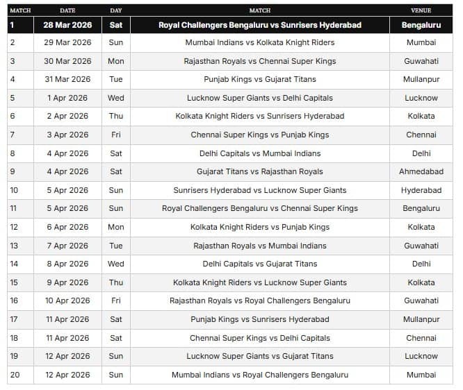 ഐപിഎൽ 2026-ന്റെ ആദ്യഘട്ട മത്സരക്രമം പ്രഖ്യാപിച്ചു. നിലവിലെ ചാമ്പ്യന്മാരായ റോയൽ ചലഞ്ചേഴ്സ് ബെംഗളൂരുവും സൺറൈസേഴ്സ് ഹൈദരാബാദും തമ്മിലാണ് ഉദ്ഘാടന മത്സരം. മാർച്ച് 28 ശനിയാഴ്ച ബെംഗളൂരുവിലെ എം. ചിന്നസ്വാമി സ്റ്റേഡിയത്തിലാണ് മത്സരം നിശ്ചയിച്ചിരിക്കുന്നത്.