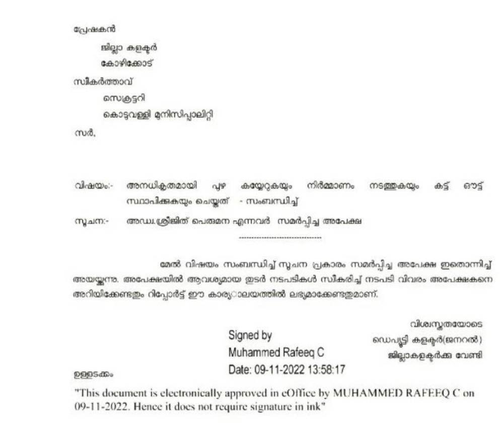 പുഴ കയ്യേറുകയും നിർമ്മാണം നടത്തുകയും കട്ടൗട്ട് സ്ഥാപിക്കുകയും ചെയ്തെന്ന് ചൂണ്ടിക്കാട്ടി അഭിഭാഷകനായ ശ്രീജിത്ത് പെരുമന നൽകിയ പരാതിയിലാണ് കളക്ടറുടെ നിർദേശം