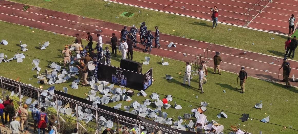 അർജന്റീനിയൻ ഫുട്ബോൾ ഇതിഹാസ ലയണൽ മെസിയുടെ 'ഗോട്ട് ഇന്ത്യ ടൂര് 2025'ൽ പ്രതിഷേധവുമായി ആരാധകർ.ഗോട്ട് ഇന്ത്യ ടൂര് 2025ന്റെ ഭാഗമായി കൊൽക്കത്തിയിൽ നടത്തിയ പരിപാടിയാണ് ആരാധകരുടെ പ്രതിഷേധമുണ്ടായത്.കാത്തിരിപ്പിനൊടുവിൽ മെസിയെ ഒരു നോക്ക് കാണാനെത്തിയ പതിനായിരക്കണക്കിന് ആരാധകർക്ക് അദ്ദേഹത്തെ കാണാനാനായില്ല. ഇതോടെ രോഷാകുലരായ ആരാധകർ വേദിയിലേക്ക് കുപ്പികളും കസേരകളും വലിച്ചെറിയുകയും വസ്തുക്കള് നശിപ്പിക്കുകയും ചെയ്യുകയായിരുന്നു.
