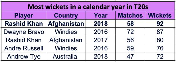 നേരത്തെ 2016 ല് 87 വിക്കറ്റുകള് വീഴ്ത്തിയ വിന്ഡീസിന്റെ ഡെയ്വന് ബ്രാവോയുടെ പേരിലായിരുന്നു ഈ റെക്കോര്ഡ്. 72 മത്സരങ്ങളില് നിന്നായിരുന്നു ബ്രാവോയുടെ നേട്ടം. 2016 ല് 56 മത്സരങ്ങളില് നിന്ന് റാഷിദ് ഖാന് 80 വിക്കറ്റുകളും നേടിയിരുന്നു. ഈ വര്ഷം ഏഴ് ടി20 ലീഗുകളിലാണ് റാഷിദ് ഖാന് കളിച്ചത്.