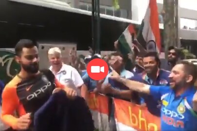 പരിശീലകന് രവി ശാസ്ത്രിയായിരുന്നു ടീം ബസില് നിന്ന് ആദ്യമിറങ്ങിയത്. ബിയര് നുണഞ്ഞുകൊണ്ടായിരുന്നു ആരാധകരുടെ സന്തോഷത്തോടൊപ്പം പരിശീലകന് പങ്കുചേര്ന്നത്. പിന്നാലെയെത്തിയ നായകന് കോഹ്ലി ആരാധകരെ അഭിവാദ്യം ചെയ്തുകൊണ്ടാണ് പുറത്തിറങ്ങിത്. ലഗേജ് എടുത്തതിനു പിന്നാലെ ആരാധകര്ക്കൊപ്പം ചുവടുവെയ്ക്കാനും നായകന് മറന്നില്ല.
