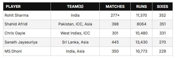 19 വർഷം നീണ്ട ഏകദിന കരിയറിൽ പാകിസ്ഥാൻ, ഏഷ്യ ഇലവൻ, ഐസിസി ഇലവൻ എന്നിവയ്ക്കായി 398 ഏകദിനങ്ങളിൽ നിന്നാണ് അഫ്രീദി 351 സിക്സറുകൾ നേടിയിയത്. അതേസമയം റാഞ്ചിയിൽ നടക്കുന്ന മത്സരം രോഹിത്തിന്റെ ഇന്ത്യയ്ക്കായുള്ള 277-ാമത്തെ ഏകദിന മത്സരമാണ്.