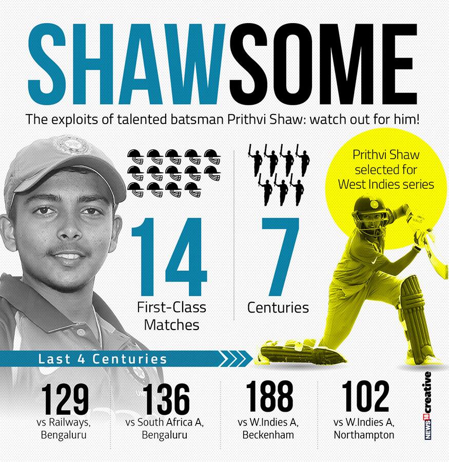 രഞ്ജി ട്രോഫിയിലെയും ദുലിപ് ട്രോഫിയിലെയും അരങ്ങേറ്റ മത്സരത്തില് സെഞ്ച്വറി നേടി ദേശീയ ശ്രദ്ധയാകര്ഷിക്കാനും ഈ പതിനെട്ടുകാരനു കഴിഞ്ഞിട്ടുണ്ട്. റെയില്വേസിനെതിരെ ബെംഗളൂരുവില് നേടിയ 129 റണ്സ്, സൗത്ത് ആഫ്രിക്കന് എ ടീമിനെതിരെ നേടി 136 റണ്സ്, വിന്ഡീസ് എ ടീമിനെതിരെ ബെക്കന്ഹാമില് നേടിയ 188 റണ്സ്, വിന്ഡീസ് എ ടീമിനെതിരെ നോര്ത്താംപ്ടണില് നേടിയ 102 റണ്സ് എന്നിവയാണ് പൃഥ്വി ഷായുടെ അവസാന നാല് സെഞ്ച്വറികള്. മികച്ച ഫോം തുടരുന്ന താരത്തിനു നാളെ വിന്ഡീസിനെതിരെയുംഅത് തുടരാന് കഴിയുമെന്നാണ് ഇന്ത്യന് സംഘത്തിന്റെ വിശ്വാസം.