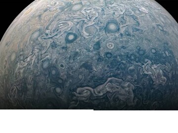 വ്യാഴം ഗ്രഹത്തിന്റെയും . വ്യാഴത്തിനു ചുറ്റുമുള്ള അതിശക്തമായ കൊടുങ്കാറ്റുകളുടെ മനോഹരമായ ചിത്രങ്ങൾ പകര്ത്തി അമേരിക്കന് ബഹിരാകാശ ഏജന്സിയായ നാസയുടെ ഉപഗ്രഹമായ ജൂണോ. ജലഛായ ചിത്രം പോലെ അതിമനോഹരമായ ഈ ചിത്രം വ്യാഴത്തില് നിന്ന് 14,600 കിലോമീറ്റര് അകലെ നിന്നാണ് പകര്ത്തിയിരിക്കുന്നത്. 2019 ജൂലൈയില് വ്യാഴത്തിന്റെ ചുറ്റും 24-ാമത്തെ തവണ വലം വെച്ചപ്പോഴാണ് ജൂണോ ഈ ചിത്രം പകര്ത്തിയതെന്ന് നാസ ഇന്സ്റ്റഗ്രാമില് ചിത്രത്തോടൊപ്പം പങ്കുവെച്ച കുറിപ്പില് വ്യക്തമാക്കി.