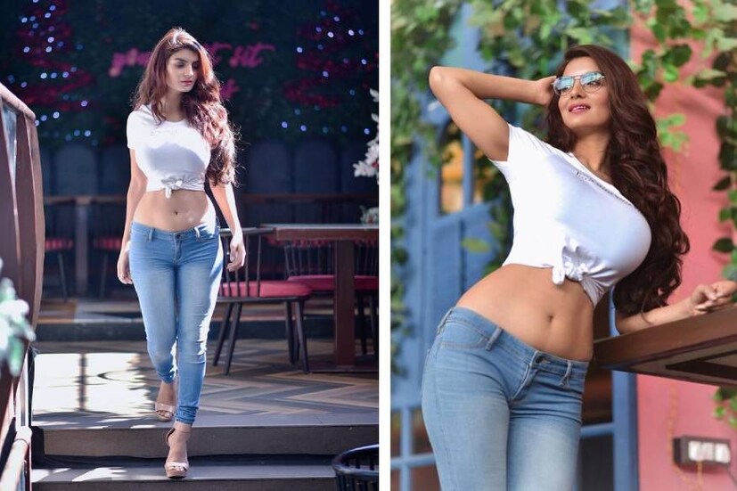 വെള്ള ക്രോപ് ടോപ്പിലും നീല ജീൻസിലും സെക്സി ലുക്കിൽ അന്വേഷി ജയിൻ. (Image: Instagram)